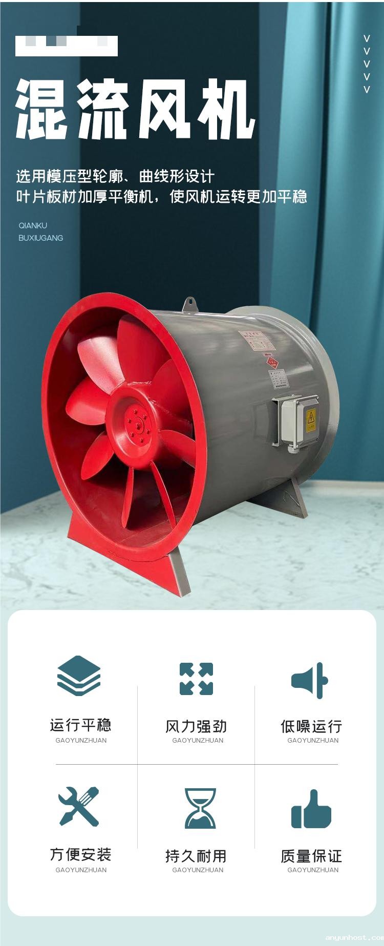 轴流风机和离心风机之间的风机,混流风机的叶轮让空气既做离心运动又做轴向运动,壳内空气的运动混合了轴流与离心两种运动形式,所以叫“混流”。