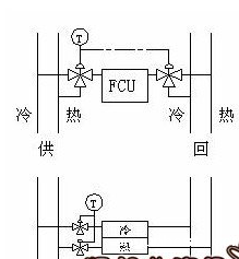 四条管道分别采用冷热水供应管和回水管系统。进出水管设转换控制阀,主要用于全年空调系统,即随时有冷热源,冷热水量由温控阀调节。