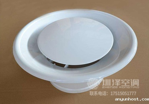 圆盘形散流器通过调节中心扇叶开度,改变空气流动方向和流型,获得不同送风效果。散流器呈倒蘑菇形,扇叶通过三根连杆悬挂在风口的壳体上,壳体在不同高度上设有3个卡口位置,连杆可停留在其中任意一个卡口上,使扇叶与出风口轮廓线围成了A、B、C三档出风风量。处于A档时散流器出口开度最小,垂直向下送风;扇叶挂在B档时散流器出口开度居中,水平送风;扇叶挂在C档时散流器出口开度最大,水平送风。