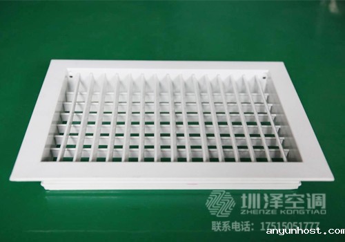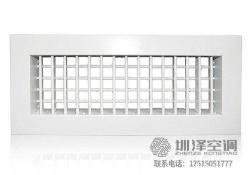 双层百叶风口,广泛应用于空调系统中作送风口,根据使用要求,风口后面可配制铝制风量调节阀(人字闸),双层百叶风口具有两层相互垂直页片调节水平和垂直页片的角度,调整气流扩散面,以改变射程,风口的外框宽度有宽边框和窄边框两种,可用于特殊要求的通风系统中。