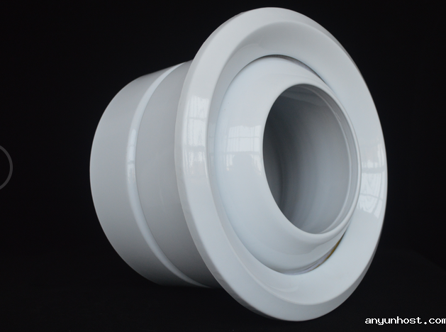 (6)球形可调出风口为喷嘴式送风出风口。高速空气流过阀体的喷嘴,以特定方向供应空气。气流喷射方向可以在顶角为35度的锥形空间内方便地前后左右调节,气流也可以通过阀门的开度和关度来调节。它是为高楼层的高速空气供应或局部冷却而设计的,例如机场候机厅、室内体育馆、酒店厨房和其他场合。