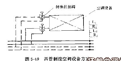 四条管道分别采用冷热水供应管和回水管系统。进出水管设转换控制阀,主要用于全年空调系统,即随时有冷热源,冷热水量由温控阀调节。
